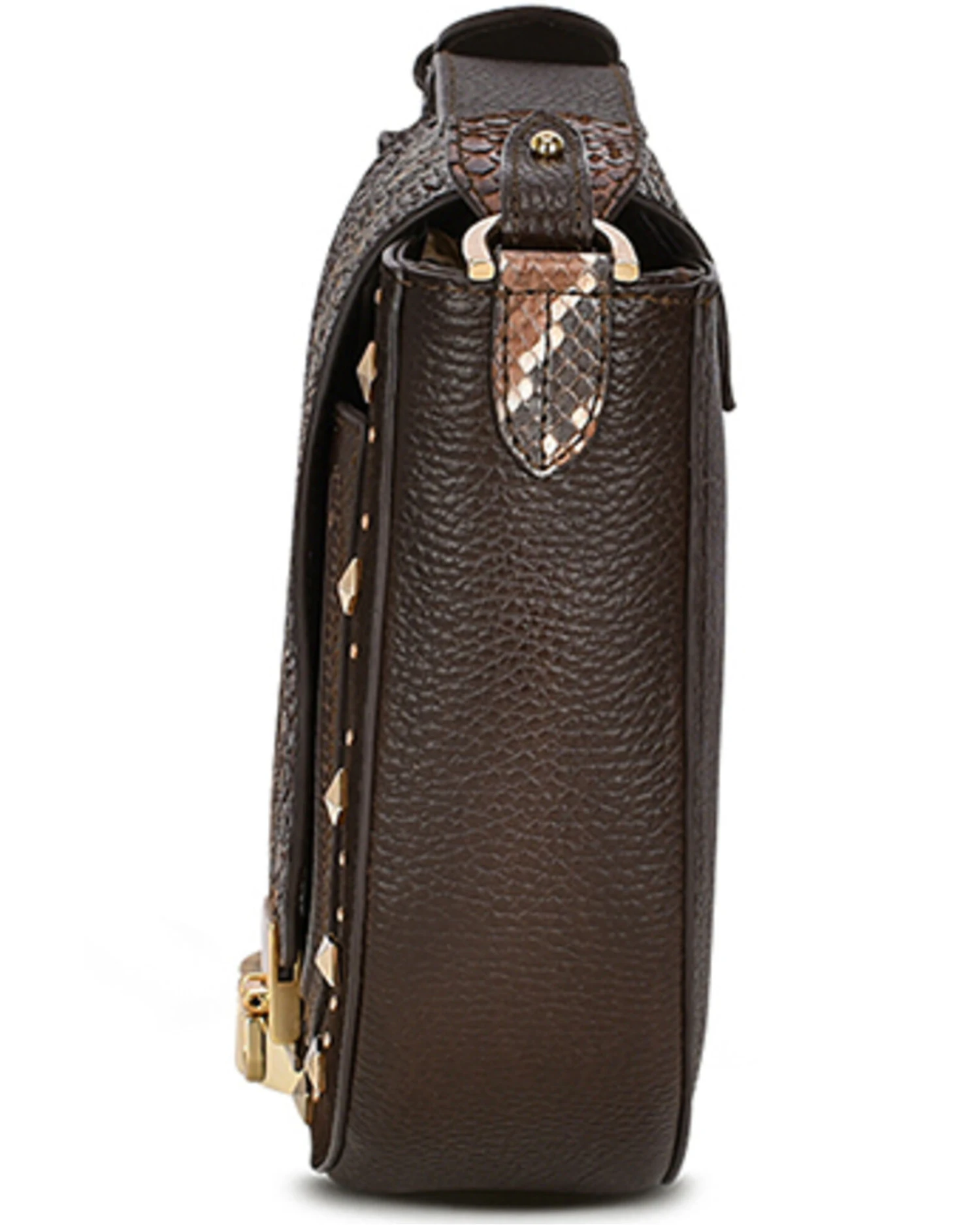 - Gold-toned studded accents throughout