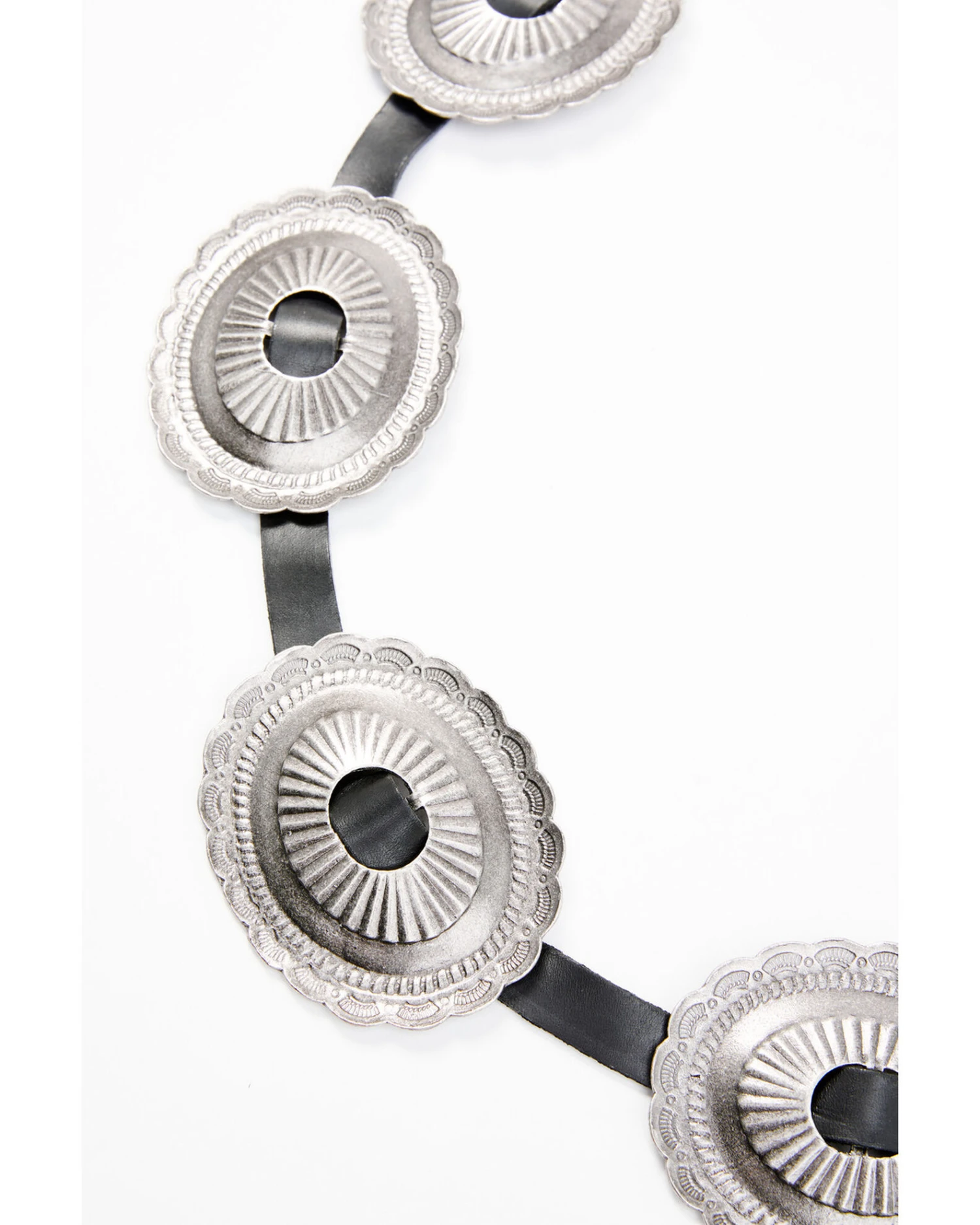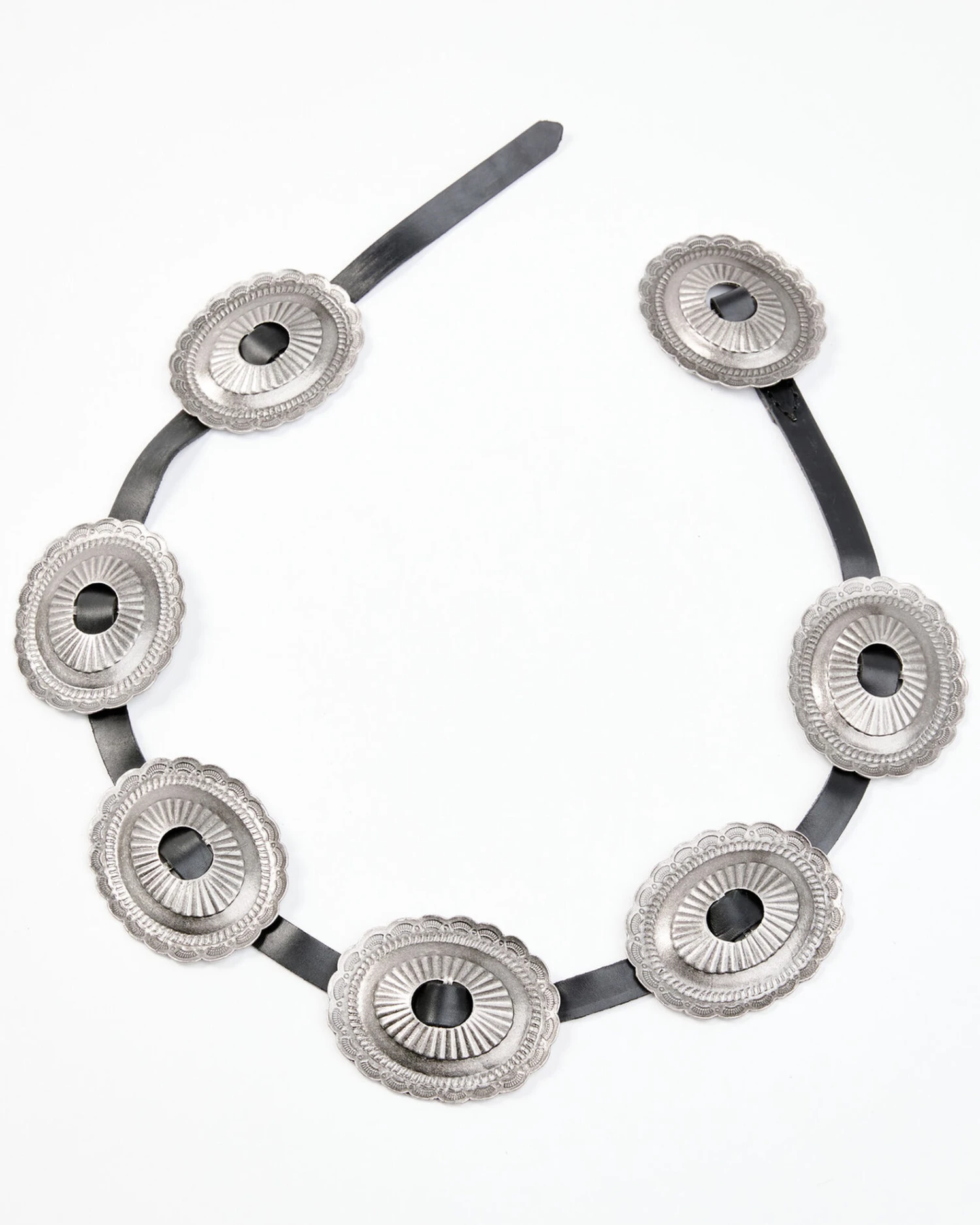 - Antique silver oval conchos with scalloped edge