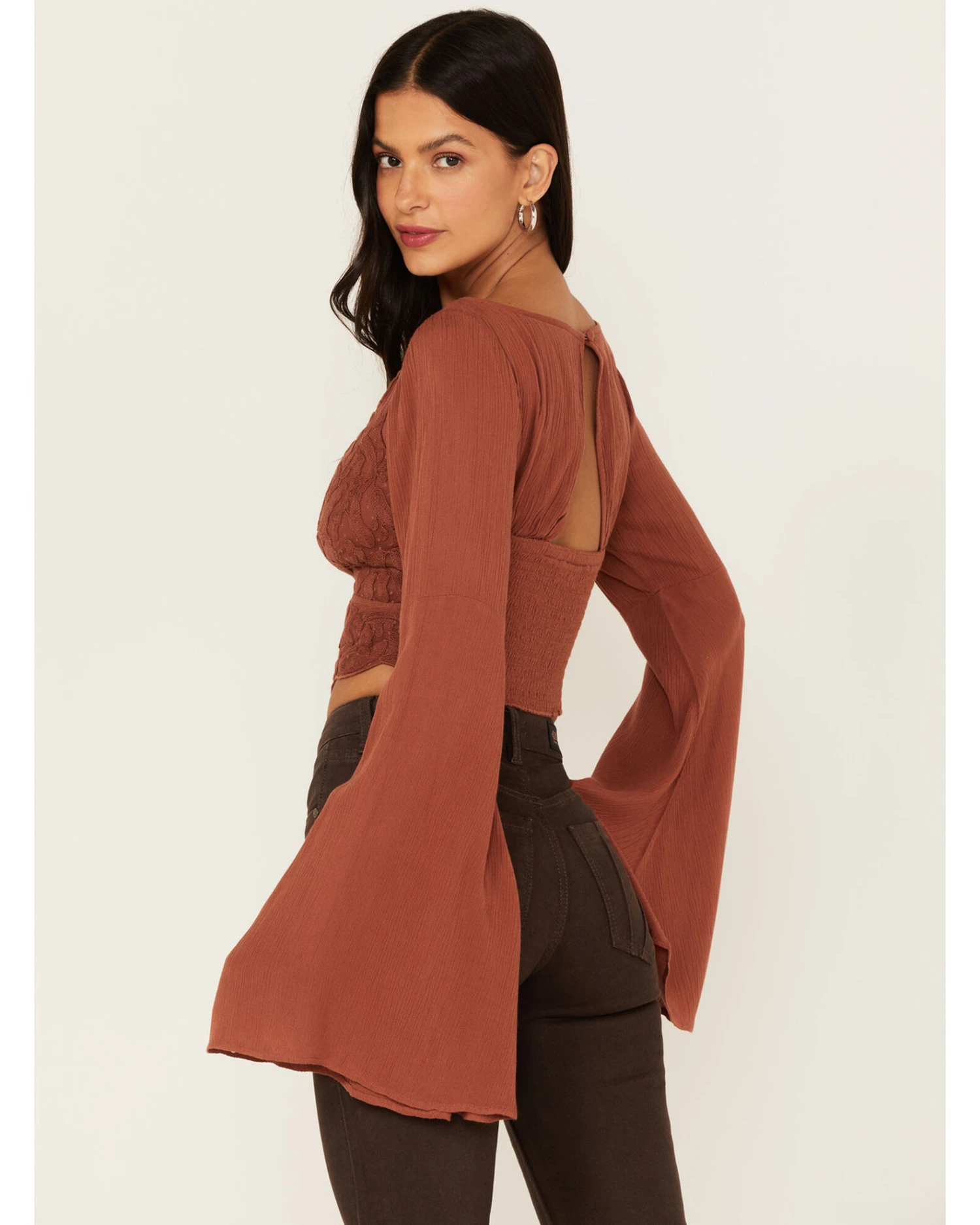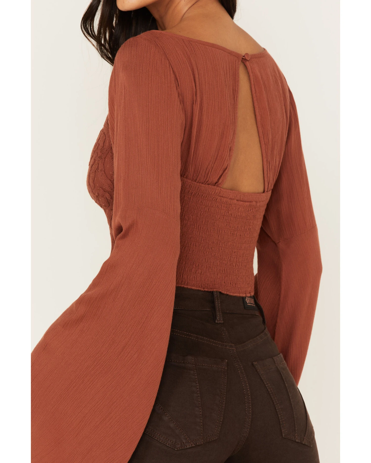 - Smocked back with keyhole and button closure