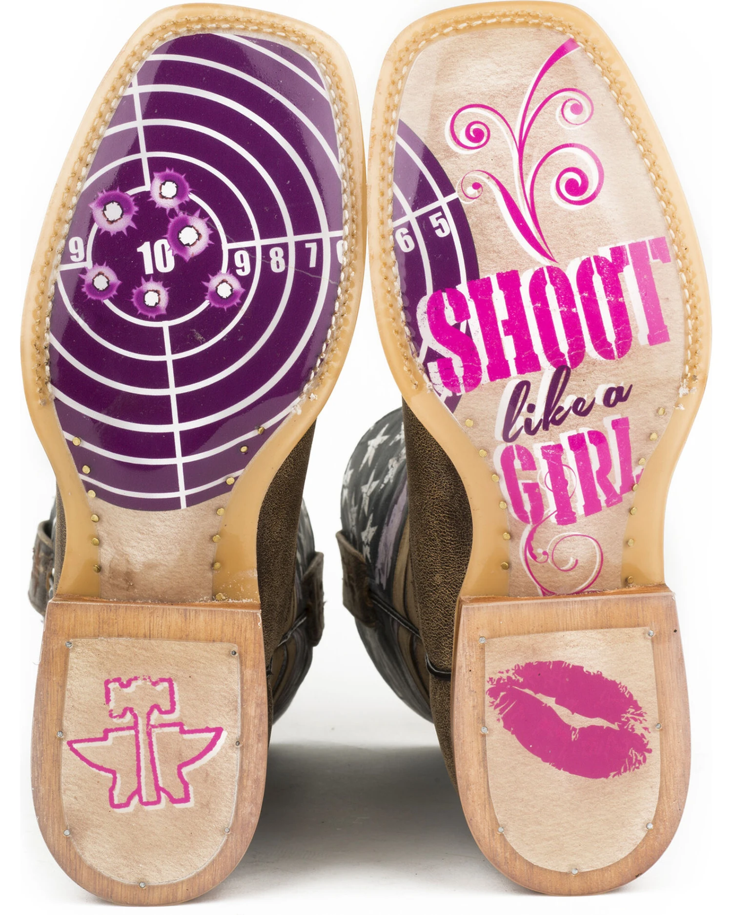 - Pink and purple target and “Shoot like a girl” printed on outsoles